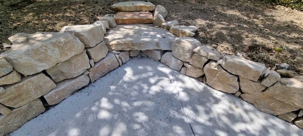 La Société RJ Aménagements Extérieurs, dans le cadre d'un aménagement de tour de piscine à réalisé ce petit muret et escalier en pierre naturelle sur la commune de Saint-Jean-de-Cornies